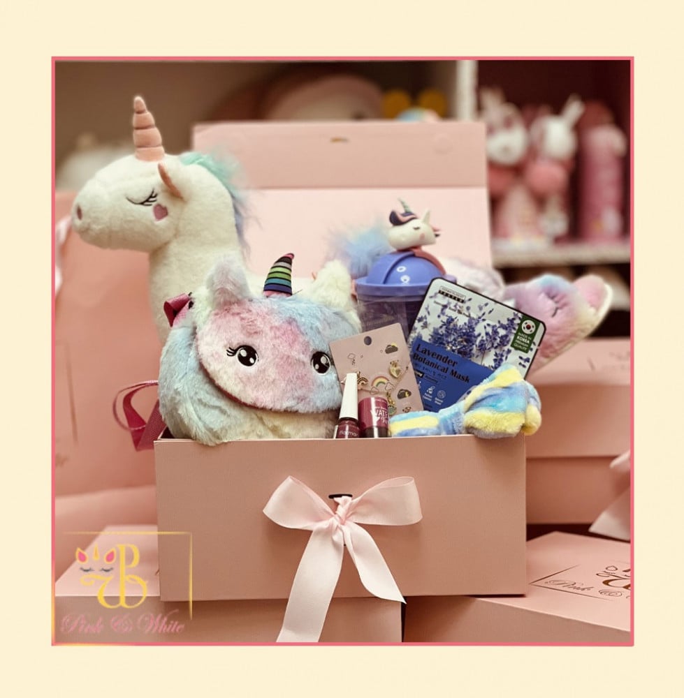- تصميم بوكس عناية مميز يحتوي على قطع تجمع بين الجمال والخيال بتصميمات يونيكورن رائعة، مثالية لمحبي الألوان والتفاصيل المبهجة.